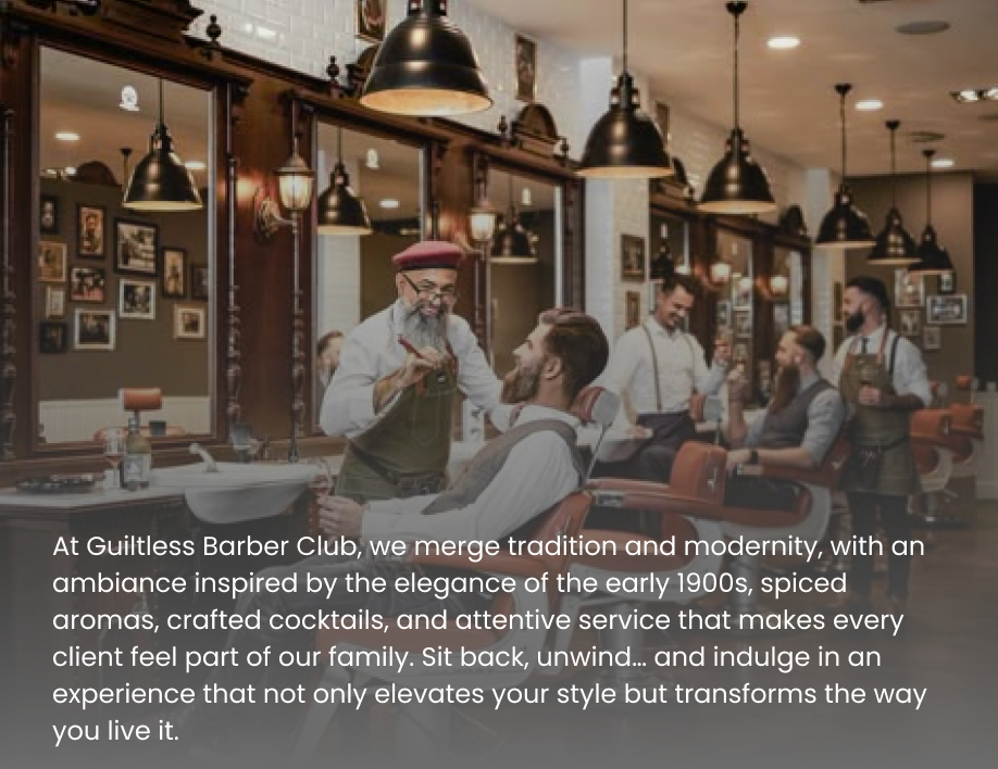 Guiltless Barber Club is more than a barbershop; it’s a space where time slows down, and every detail is designed for your style and well-being. Every haircut, shave, and massage becomes an experience that blends precision, care, and sophistication.